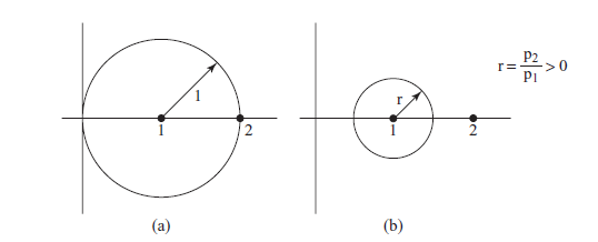 は固有値 \(1\) と \(2\) を持つが,無重みのゲルシュゴリン円盤をそのまま使うとかなり粗い推定しか得られない(図 6.1.7(a))。一方で適切な正の重み \(p_1,p_2\) を取れば円盤を狭められ,任意に良い精度で固有値を囲むことが可能である(図 6.1.7(b))。
